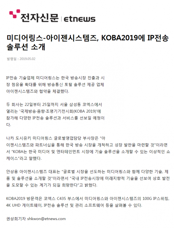 권상희, 미디어링스-아이젠시스템즈, KOBA2019에 IP전송 솔루션 소개, 전자신문, 2019.05.02, http://www.etnews.com/20190502000641